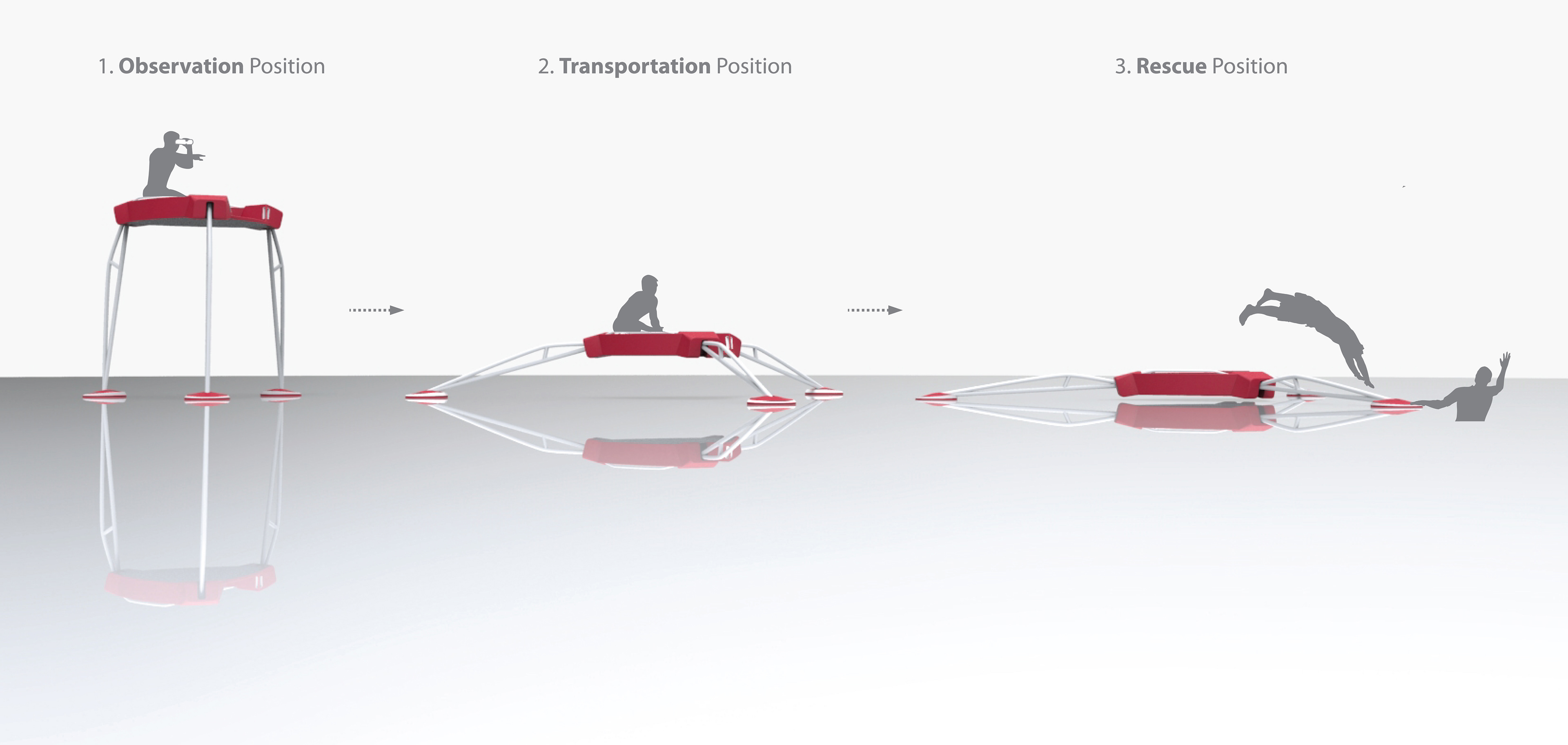 Molnárka - universal rescue boat for Lake Balaton. Bosch design award winner project. Molnarka is an engined boat capable for lifting its hull about 13 ft above water, at any point on still water surface. The concept was to design a rescue base that can be optionally placed for sighting, so the rescue procedure can be immediately initiated from water, after notice of emergency. In case of water accidents, it’s very important that the rescue procedure takes effect as fast as possible. The patrolling rescuer may ascend above water surface, so it’s easier to notice the swimmer in trouble, and the rescue may begin immediately. The inner space of the hull lets the rescuer see the whole horizon, while the independent control of the two motors lets the boat move fast and dynamically. During the rescue procedure the boat descends to the water surface allowing the rescuer to pull out the swimmer. These factors lead to such timesaving that unambiguously improves the chances of a successful rescue and may decide on life or death. The boat can be manufactured cost effectively (~$2000)